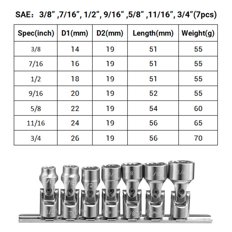 SAE: 3/8”,7/16”, 1/2”, 9/16”,5/8” ,11/16”, 3/4”(7 Stück.)