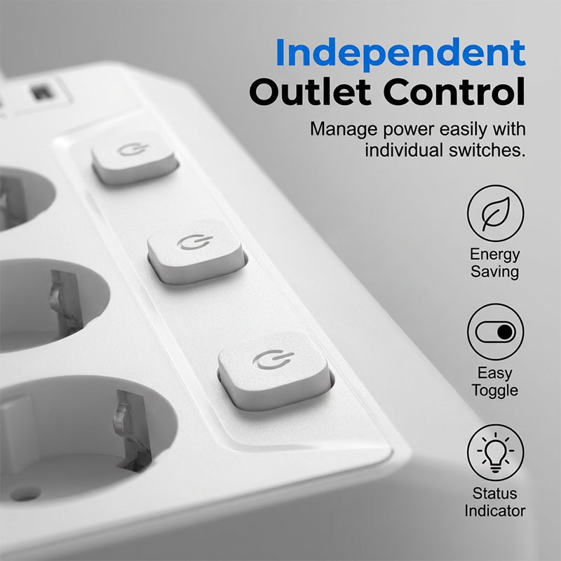 INDIVIDUELLE SCHALTERSTEUERUNG – Steuern Sie die Stromversorgung jedes Geräts separat, um den Stromverbrauch im Standby-Modus zu senken und die Sicherheit zu erhöhen. Sie können nicht genutzte Geräte ausschalten, ohne den Stecker zu ziehen, und so sowohl Energie als auch Aufwand sparen.