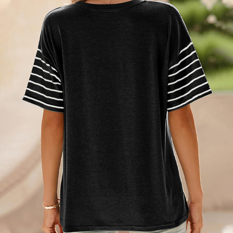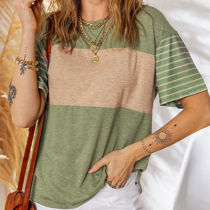 🌸Lässiges Damen-Oberteil mit Rundhalsausschnitt, gestreiftem Farbkontrast und kurzen Ärmeln