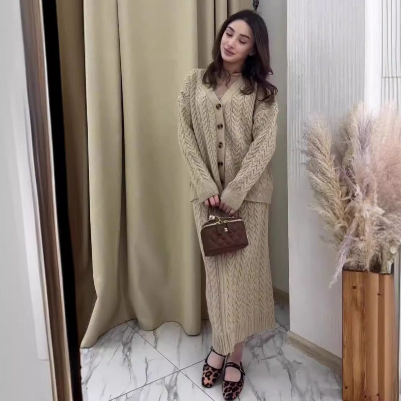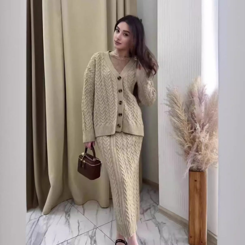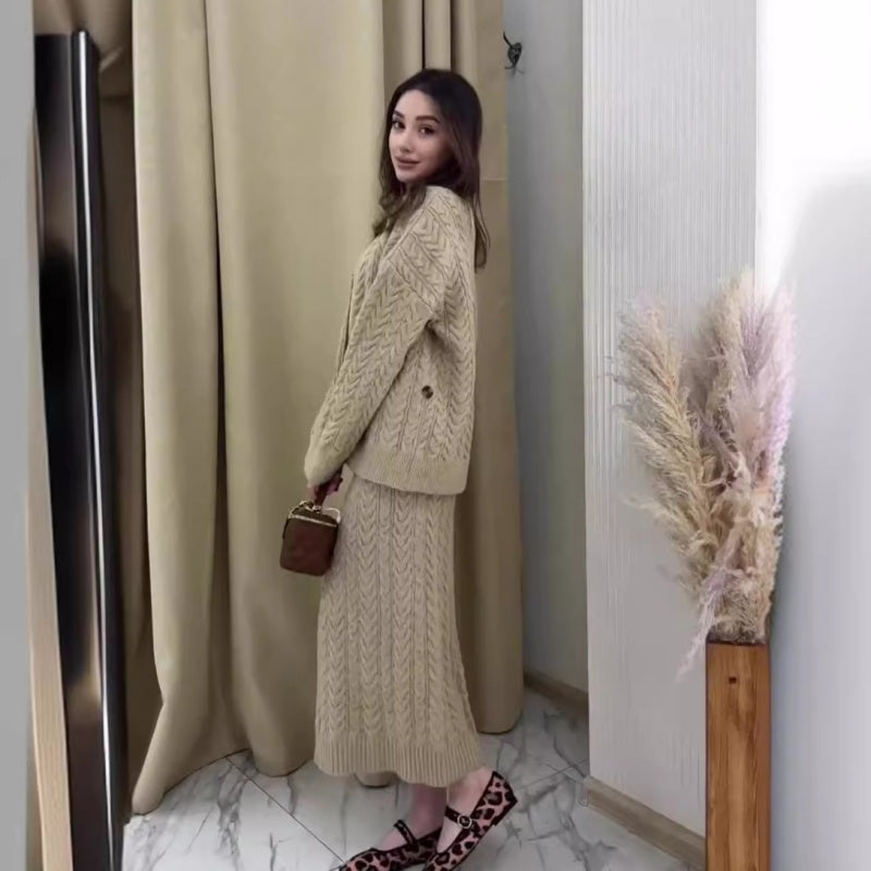 Solid Color Loose Knit Jacket & Skirt 2-Piece Set